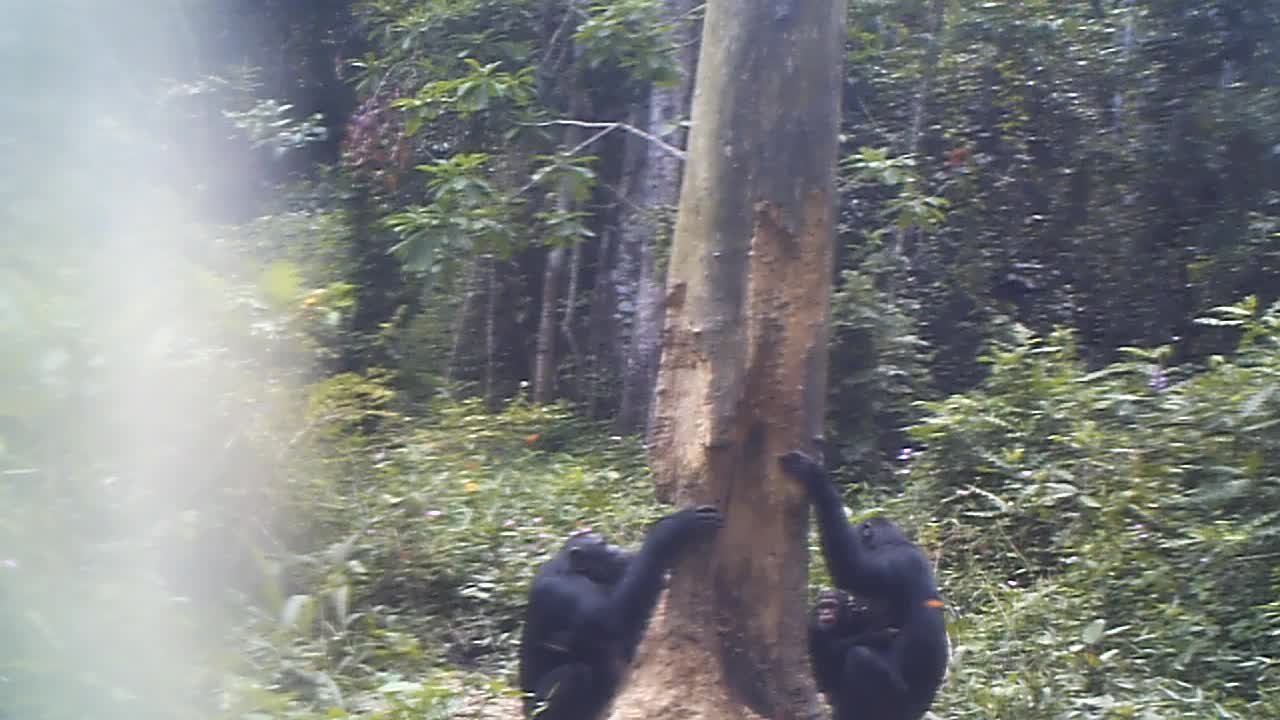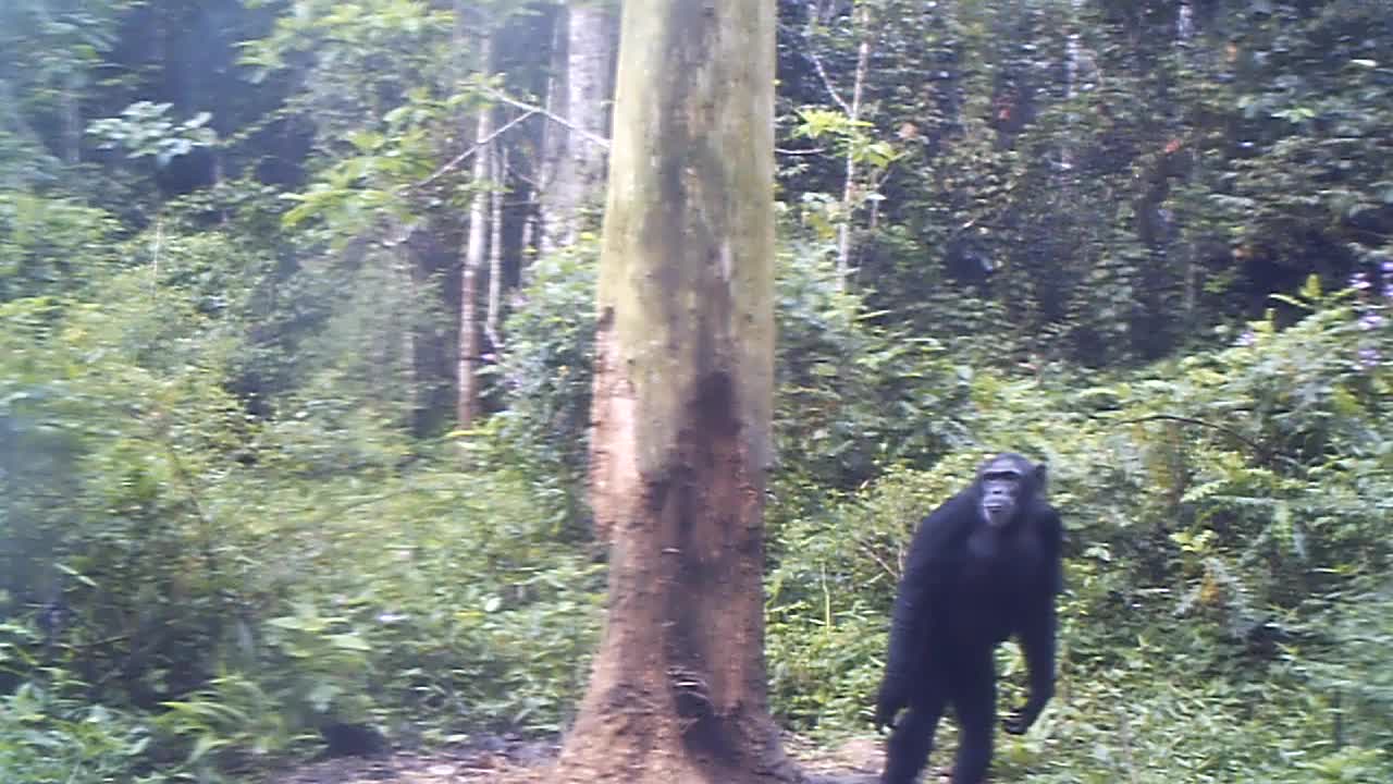 In fact, we have the interesting situation here that we do see on the same camera and at the same day a group of chimps followed by researchers (we think the Ngogo chimps) and later at night chimps that we identified as belonging to our main group (Bohr, Cassini). So, two different groups on the same territory at the same day. Maybe the nightchimps travel there at night because they want to avoid the other group - or the human presence?
